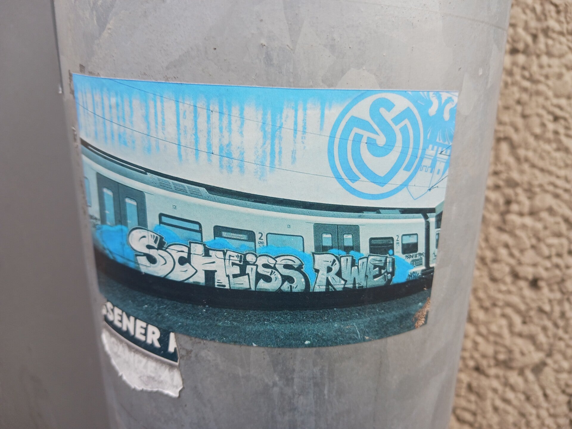 Diese Konservierung ist besonders wichtig für Botschaften, die sich an Orten befinden, an denen sie keine lange Halbwertszeit besitzen. So ist der Aufkleber zu erklären, den einige MSV-Fangruppen im Duisburger Stadtraum anbringen und der einen Zug zeigt. Auf blauem Grund wurde darauf ein Graffiti-Piece angebracht, das die Abkürzung des verfeindeten Vereins Rot-Weiß-Essen um eine Beleidigung ergänzt.