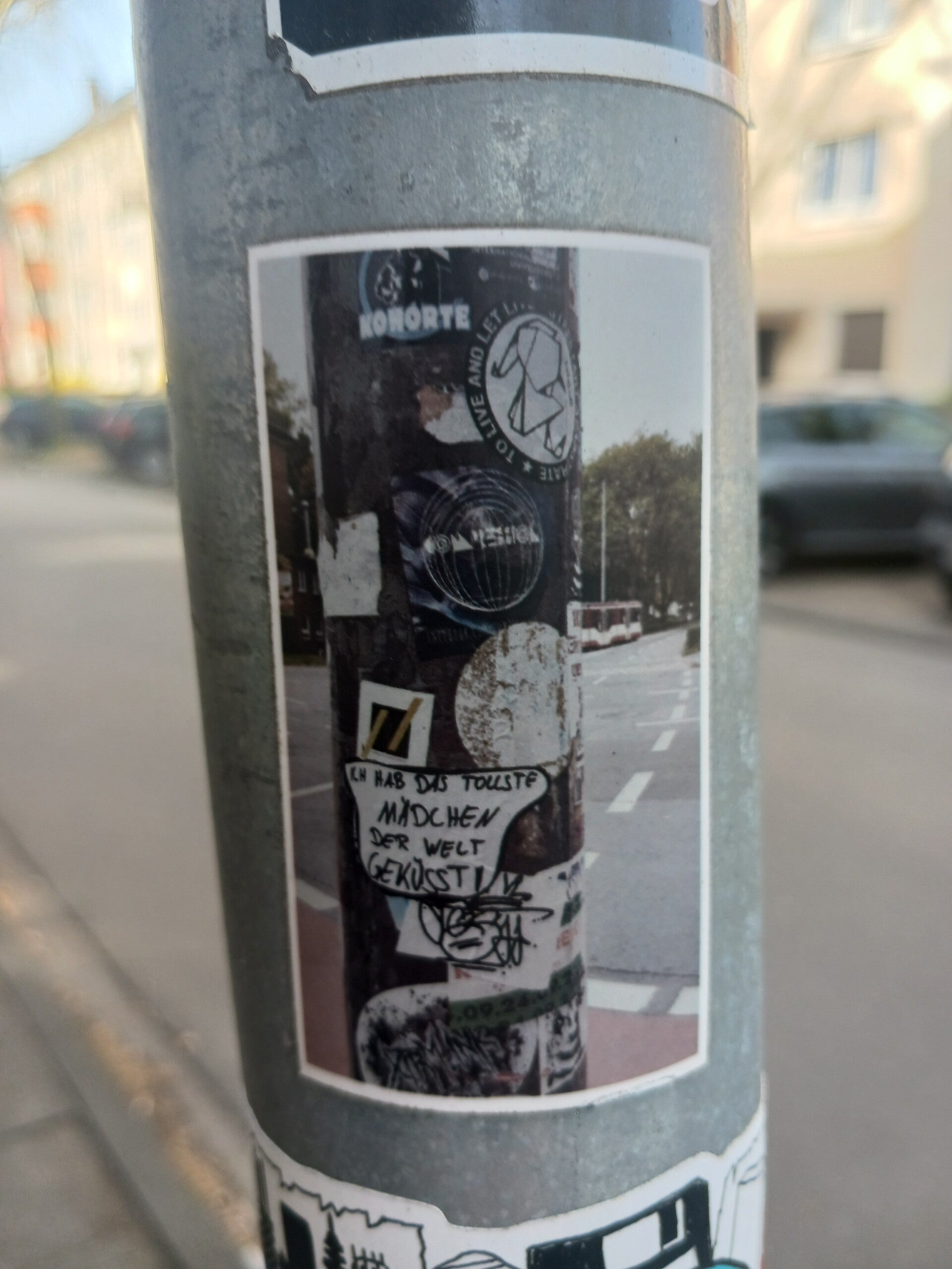 Noch selbstreferenzieller sind die Aufkleber, auf denen andere Aufkleber zu erkennen sind. Diese kleinen Kleber hängen in der Nähe eines Cafés in der Neudorfer Holteistraße in hoher Dichte. Da ist zum einen das Foto einer vollgestickerten Straßenlaterne zu sehen, unter anderem erkennt man eine Arbeit von Dellephant und einen Sticker der MSV-Ultras Kohorte. Als Originalstandort ist die Straßenkreuzung Schweizer Straße/Mülheimer Straße zu identifizieren.