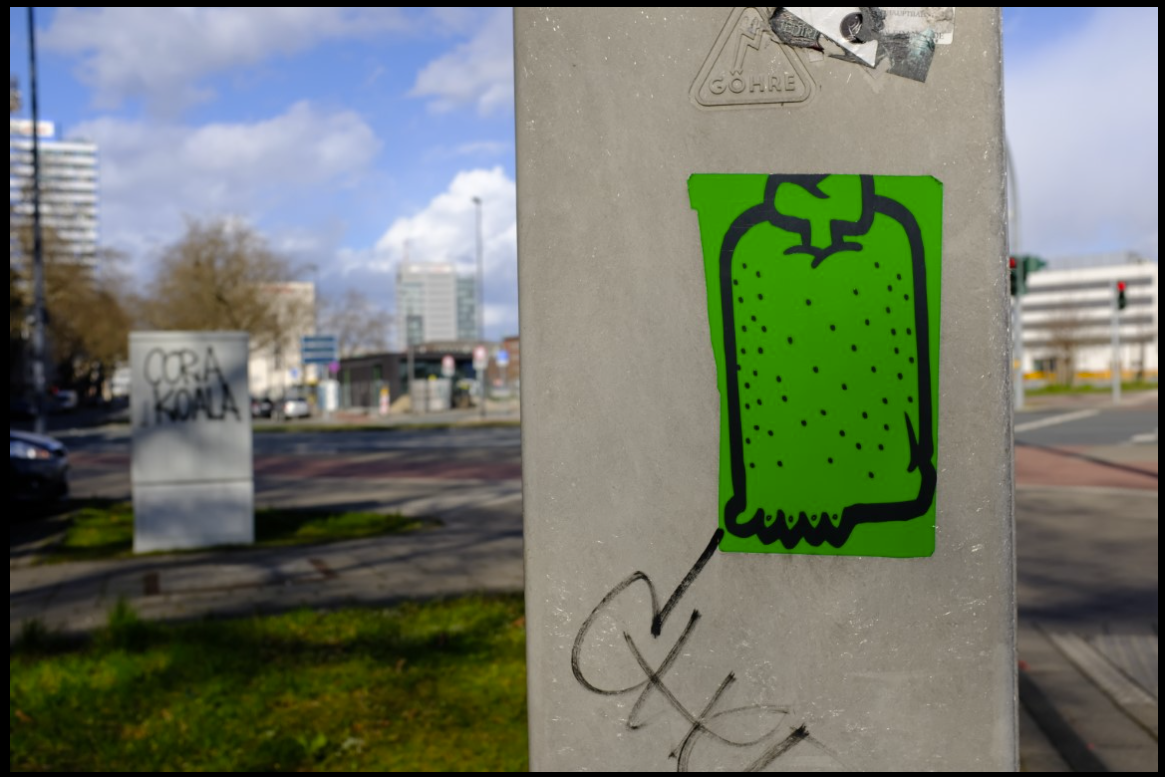 Die Fotodokumentation der Duisburger Künstlerin Heike Marianne Liwa macht deutlich, dass die rechteckigen Stickerreste früher von einem Motiv ausgefüllt wurden: Zu sehen war ein gezeichneter Comic-Fuß mit stopeliger Beinbehaarung und Zehen. Dieser schloss vor dem Knie mit einem sauberen Schnitt ab. Lediglich ein Knochen ragte aus dem Stumpf. Und das Bein war nicht nur auf die Gegend um das Dellviertel herum präsent, sondern fand sich an vielen Stellen im Stadtraum.